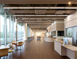 観光・産業の創出による地域の活性化を期待し、利用者や地域住民に対して「サービス提供・情報発信・地域連携」を行い、地域づくりの核となるよう計画しました。海辺に建つ利点を活かし、潮風や眺望を大切にしながら、護岸に船が停泊しているような、水平性を強調した外観としています。全長100mの平屋の施設内部には、観光案内所や特産品販売所・フードコートを一体的に設け、開放感のある空間としています。