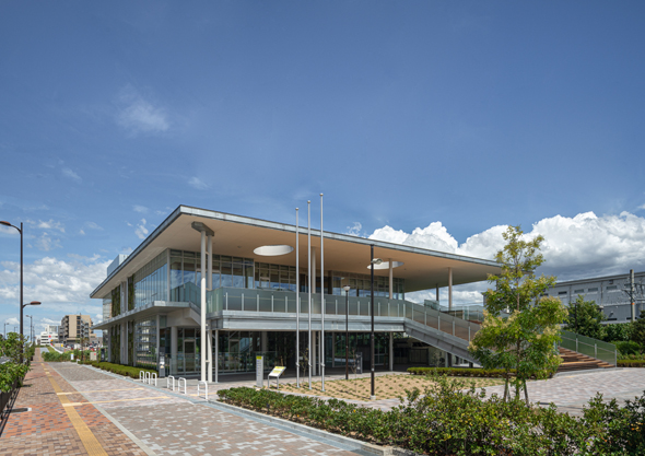 吹田市立健都ライブラリーは北大阪健康医療都市(健都)内での健康づくりを支援する拠点として、健都レールサイド公園とともに『「健康」に「気づき」「楽しみ」ながら、「学べる」』の3つのコンセプトのもと、多世代が集い、交流し、気軽に健康づくりに取り組むことができる場です。  図書館の1階には健康支援を目的として健康に関する本を集めた健康・医療・スポーツコーナー、様々な世代から根強い人気のある0新幹線を展示したすいたメモリアル、憩いの場として利用できるカフェスペースを、2階には児童開架・子ども達の為の絵本コーナーと一般開架室、イベントの行える多目的室を配置することで、多世代が集い、交流し、健康寿命延伸(生活活躍)につながる施設となっています。 また、太陽光発電設備、深い庇と開口部のLow-Eペアガラス、壁面緑化の採用をはじめとする環境に配慮した建築としてCASBEE Sランクを取得しています。